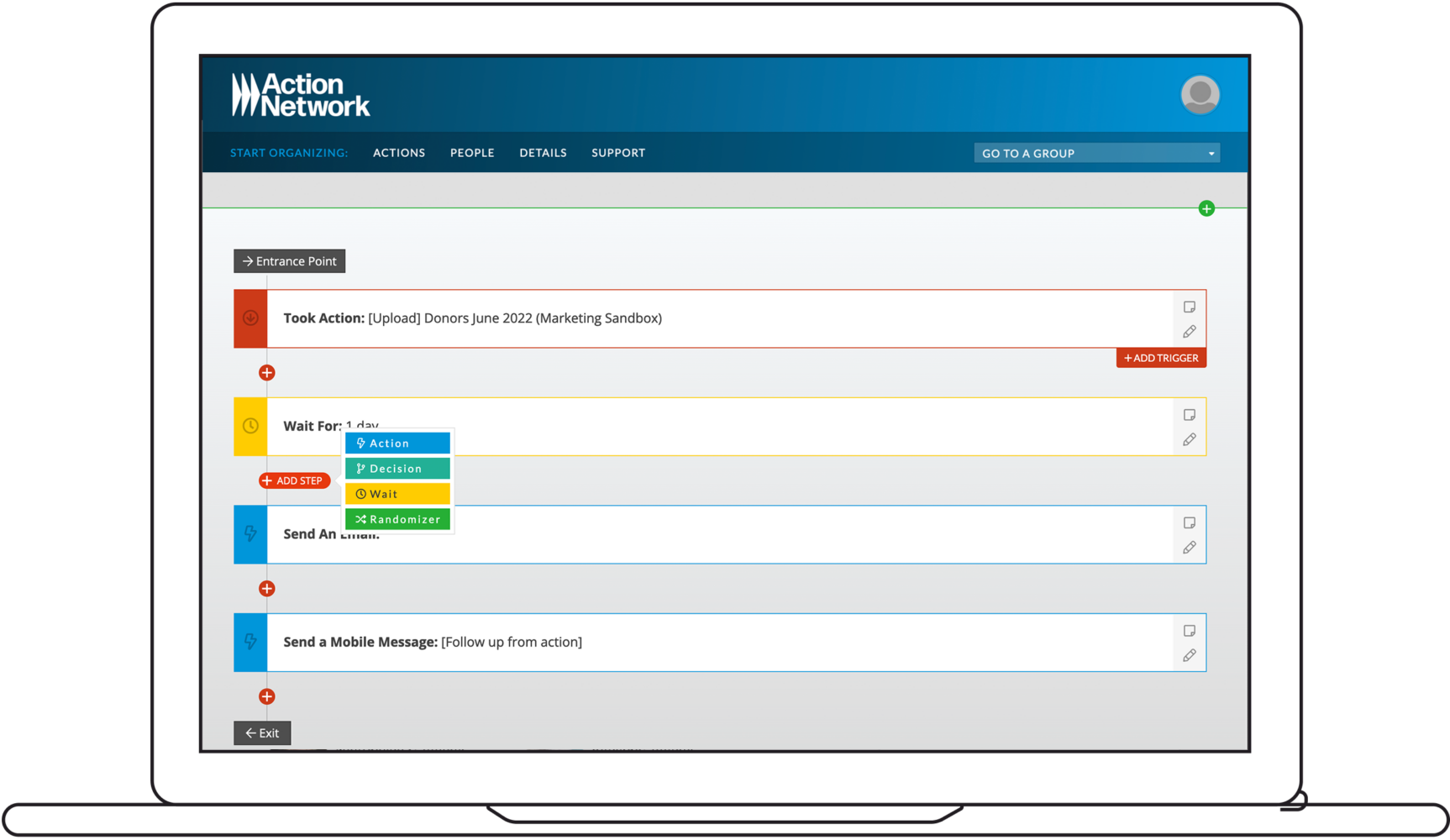 Move activists through different paths using decision trees based on the actions they take.